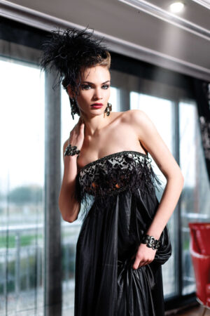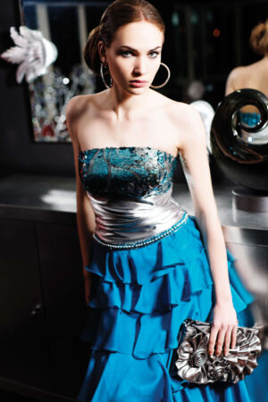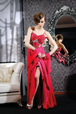 Crafted from high-quality silk, this form-fitting gown features a sleek silhouette enhanced by hand-sewn beaded embellishments along the waist and back. The deep purple color evokes opulence, while the open-back design adds a touch of modern sophistication. This gown is perfect for evening galas or high-end formal gatherings.